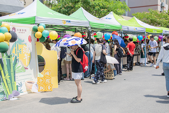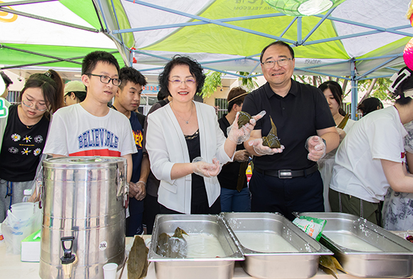 本次活动设置了端午“粽”动员、“乾坤一掷”投壶大赛、端午知识问答、手绘扇面、DIY龙舟拼图、夏日冰饮季、古筝表演和制作艾草花环等项目,活动现场气氛热烈,约有上千名同学参与其中,炎炎夏日也挡不住同学们的参与热情。每一个项目都有同学在有序排队参与,现场还有身着学位服的毕业生同学打卡留念,留下对母校的深深祝福,记录美好的校园回忆;食堂主厨现场指导,洗好的糯米、泡好的粽叶和各种馅料已准备齐全,白米粽、蜜枣粽、蛋黄粽、肉粽等各色各样的粽子让人大饱口福;现场同学一起编织五彩绳,用自己独特的编结技法,编织出一系列精美的作品;学院老师现场手绘团扇,将可爱的图案与美好的祝福绘于扇面之上,送给幸运的同学。学校领导与现场同学一起包粽子、品凉茶、编五彩绳、拼龙舟拼图、制作艾草花环,大家其乐融融,共同感受传统节日氛围。学院还为参与活动的同学准备了粽子、鸡蛋、香囊、小葫芦、五彩绳等端午小礼品,师生共同迎接端午佳节。