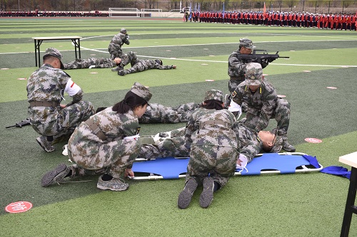 战地救援演习由我校教官团扮演的中国人民解放军突击小队,在无人机的预先侦查后,模拟与敌军对抗的战术背景下,迅速移动至作战地域,并针对患开放性气胸等伤员进行紧急医疗救治与转运的场景,演示接敌、突入、营救、阻敌、撤离等内容。