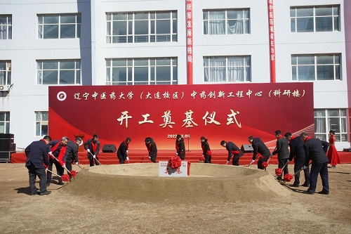 各级领导、嘉宾挥锨为yl6809永利官网(大连校区)中药创新工程中心(科研楼)项目封顶浇灌最后一方混凝土。