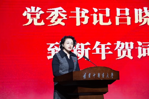吕晓东代表学校党委致新年贺词,向全校教职员工、青年学生、离退休老同志、海内外校友致以新年的问候和诚挚的祝福,向长期关心支持学校发展的社会各界朋友致以衷心的感谢和美好的祝愿。