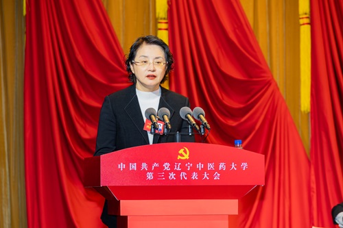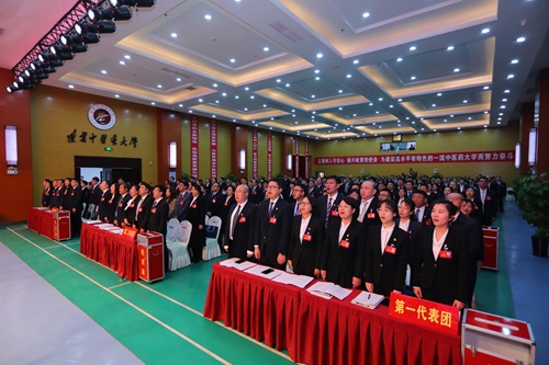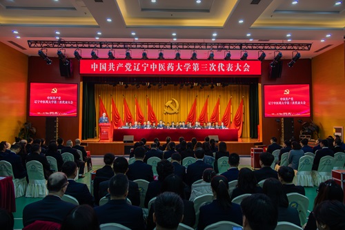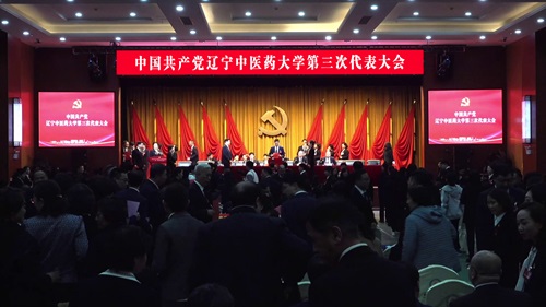 大会会场气氛庄重热烈,主席台正中悬挂的中国共产党党徽熠熠生辉,10面鲜艳的红旗分列两侧。会场后方“立德树人守初心 振兴岐黄担使命 为建设高水平有特色的一流中医药大学而努力奋斗”的醒目标语,鼓舞人心、催人奋进。
